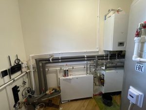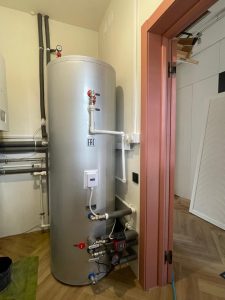 В связи с крайне небольшими размерами котельной, установлен именно комбинированный бак Gemini 2 в 1, который объединяет в одном корпусе объемный бойлер косвенного нагрева 250 л для приготовления горячей воды и буферную ёмкость 80 л. С помощью буферной ёмкости, в зависимости от поставленной задачи, тепловой насос будет работать в режиме многозадачности: отопление, охлаждение, автоматическая разморозка теплового насоса зимой. Отопление дома реализовано через систему теплых полов. Охлаждение – через фанкойл.